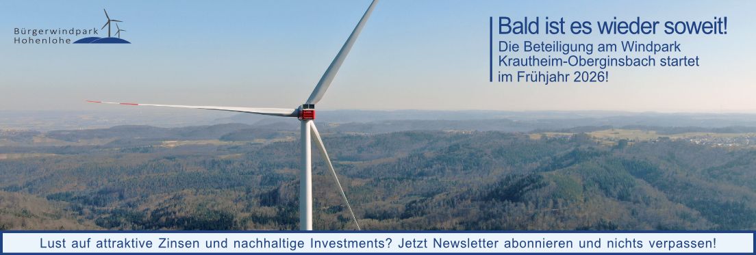 Für alle die dieses Mal nicht zum Zuge gekommen sind, sich erneut oder vielleicht zum ersten Mal beteiligen möchten: Wir bereiten Beteiligungsmöglichkeiten am geplanten Bürgerwindpark Krautheim-Oberginsbach sowie am Bürgersolarpark Cleversulzbach vor. Beide Beteiligungen werden voraussichtlich im neuen Jahr zur Verfügung stehen.