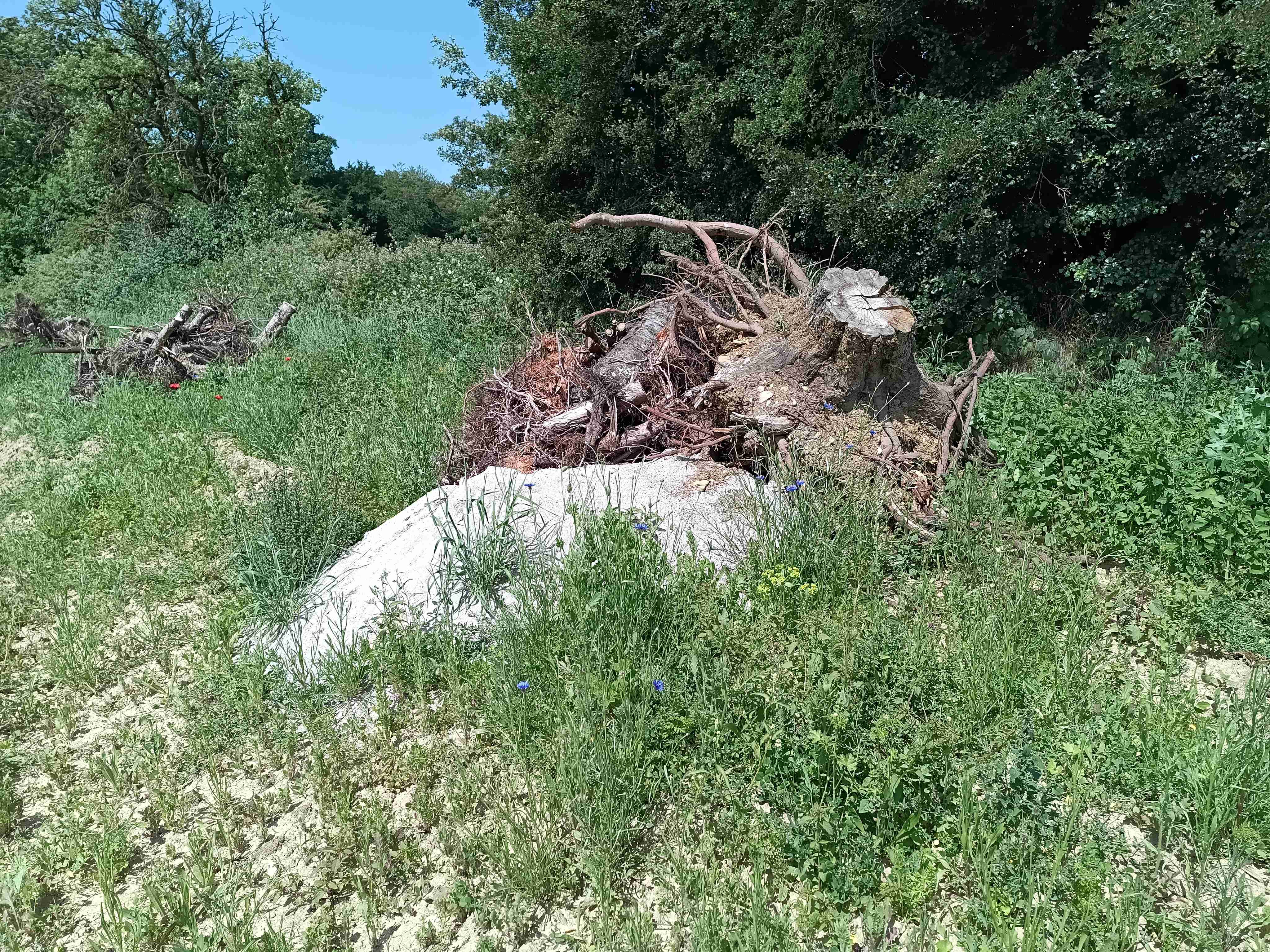 Ausgleichsmaßnahme für einen artenschutzgerechten Lebensraum der Zauneidechse: Sandlinse mit Wurzelstöcken und Blühmischung angelegt